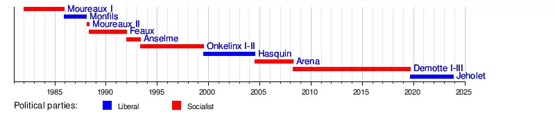 13 September 2019 | Incumbent | 4 years, 78 days | MR | Jeholet II | PS, MR, Ecolo |