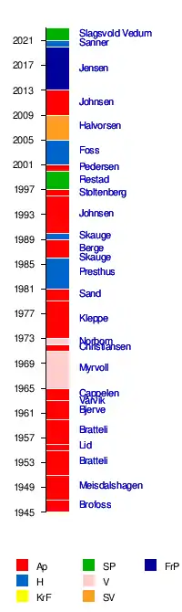 Ulf Sand | Labour | 8 October 1979 | 14 October 1981 | 2 years, 6 days | Nordli Brundtland I |