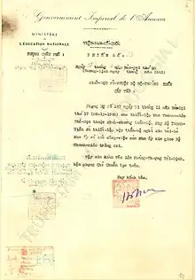 While the Học Bộ was nominally a part of the Nguyễn dynasty's administrative apparatus, actual control was in the hands of the French Council for the Improvement of Indigenous Education in Annam, which dictated its policies.[8] All work done by the ministry was according to the plans and the command of the French Director of Education of Annam (監督學政中圻, Giám đốc Học chính Trung Kỳ).[7] The French administration in Annam continuously revised the curriculum to be taught in order to fit the French system.[7]