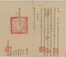 According to a document made on 09-01-Duy Tân 2 it was reported that the Học Bộ didn't have its own seals yet, so the Ministry of Education, Cao Xuan Duc, asked for a quan phòng seal for his office, 1 quan phòng seal for the Tham tri.[7] The ministry considers that the documents presented are in compliance with the implementation rules.[7] The seals were made by the Hữu ty and were made of bronze.[7] The Bộ ấn (部印) had the inscription Học Bộ chi ấn (學部之印) in seal script and was 9,0 cm x 9,0 cm.[18][7] Meanwhile, the kiềm ấn had the inscription Học Bộ (學部) in script and was 2,7 cm x 2,7.[18][7] The big seal was used to stamp the date while the smaller seal was used to close in important positions and erasing characters, among other tasks.[7]