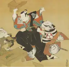 Minium is common on Japanese paintings of the Ukiyo-e school in the seventeenth through nineteenth centuries. The orange color on these works has generally been well preserved because the paintings were mounted on scrolls and subsequently rolled up and protected (as seen in Three Actors Playing a Scene from the Freer Gallery of Art, Washington). Some areas of brown red lead, however, are present in the work.[1]: 117