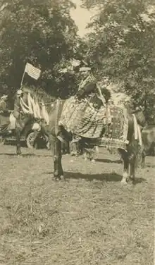 Life on the reservation was fairly typical of a rural farming environment, as was described by John Henry Hauberg, Sr. an attorney, businessman and noted local historian from Rock Island, Illinois. Hauberg had a relationship with Jesse KaKaQue for a number of years, taking photographs and exchanging correspondence from 1914 to 1918, which is housed in the Special Collections Department at Augustana College.[14] In 1916, he visited Minnie and Jesse at her allotment, because according to custom, men lived with the wife's family after marriage and his allotment was in Oklahoma. Hauberg described a tidy farm, with all buildings in use, a typical painted farmhouse with a sitting room, bed room, kitchen, photographs on the wall and a piano. He also noted that Minnie was raising about 200 chickens and that the farm "was exactly like any white man's farm".[2]