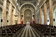 The interior has three naves, one central and two lateral ones with perimeter chapels; the central nave is covered with a barrel vault and ends with a semicircular apse surrounded by an ambulatory with women's gallery and preceded by the dome with frescoes depicting the apparition of Our Lady of the Rosary to St. Pius V to announce the victory of Lepanto (1571). Inside the basilica, on the walls and on the vaults there are frescoes dating back to the 19th and 20th centuries, while the only original portion of the church is the chapel of the Baptistery, dating back to the 12th century. In addition, a number of frescoes including the Life of Jesus (1881) on the walls by Casimiro Radice and the Glory of the Madonna of the Rosary (1925) on the ceiling by Luigi Morgari. The fifth chapel on the right nave contains 14th-century frescoes and a 16th-century baptismal font.[1]