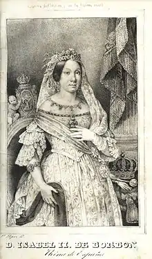 Isabella II of Spain (10 October 1830 – 9 April 1904) was barely three years of age when her father Ferdinand VII of Spain died on 29 September 1833. Her minority age was marked first by the regency of her mother Maria Christina of the Two Sicilles and then under General Baldomero Espartero, covering almost ten years of her reign, until 23 July 1843, when Isabella was declared to be of age.