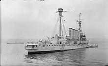 In early 1915, the sisters were all assigned to the Grand Fleet, each as flagship of their respective squadrons.[21] Just before the Battle of Jutland on 31 May 1916, the 2nd and 7th Cruiser Squadrons were combined with Minotaur as the flagship.[22] During the battle the 2nd Cruiser Squadron was unengaged and did not fire their guns.[23] In contrast the 1st Cruiser Squadron was engaged at close range by the German capital ships during the battle;[24] Defence was hit by two salvoes from the German ships that caused the aft 9.2-inch magazine to explode. The resulting fire spread via the ammunition passages to the adjacent 7.5-inch magazines which detonated in turn.[20][25] The ship exploded with the loss of all men on board;[24] between 893 and 903 men were killed.[26]