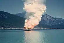 On November 26, 1967, John Nelson died at the age of 88 years. Minto did not long survive him. Far down the lakes, the enormous Keenleyside Dam was being built that would rise 170 feet, and when complete, would raise all the lake levels, drowning the Narrows between the upper and lower Arrow Lakes, and submerging all the landings and many of the towns along the shore under water as much as 40 feet deep. BC Hydro which was building the dam, offered to move and restore Minto, but only if someone else paid the cost which was estimated at $100,000. John Nelson's son Walter didn't have the money and Minto's deteriorated condition after over ten years out of service did not seem to warrant any further effort to preserve her. On August 1, 1968, she was towed out into the lake to be deliberately burned. Walter Nelson, son of her last owner, lit the match to set fire to the boat, and in a few minutes, the vessel's upper works were consumed in the flames. The hull was later sunk.[4]