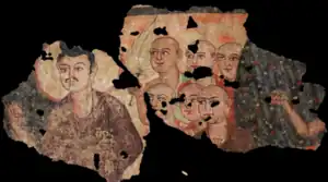 Fragment of a wall painting from a stupa in Miran depicting the Buddha (leftmost) followed by six disciples