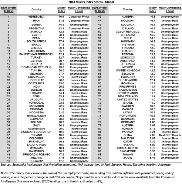 Hanke has recently constructed a World Table of Misery Index Scores by exclusively relying on data reported by the Economist Intelligence Unit.[5] This table includes a list of 89 countries, ranked from worst to best, with data as of December 31, 2013 (see table below).