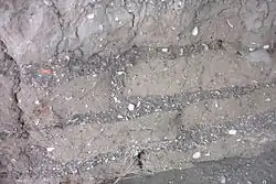 The adobe bricks resting on the foundation were cemented with the same mixture and placed in an alternating fashion to give the walls more strength and stability. The walls were from 0.90-1.10 meters thick. The adobe was made with local soil, water, clay, and sand; unlike the other missionary complexes of the area, these were mixed with pebbles and crushed shells instead of the usual straw, to make the material tougher.