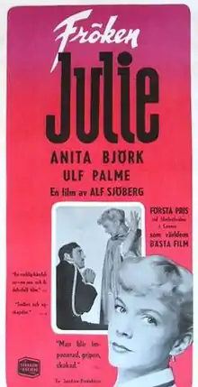 Miss Julie (Swedish: Fröken Julie) is a 1951 Swedish drama film directed by Alf Sjöberg and starring Anita Björk and Ulf Palme, based on the 1888 play of the same name by August Strindberg. The film deals with class, sex and power as the title character, the daughter of a Count in 19th century Sweden, begins a relationship with one of the estate's servants. The film won the Grand Prix du Festival International du Film at the 1951 Cannes Film Festival.[1]