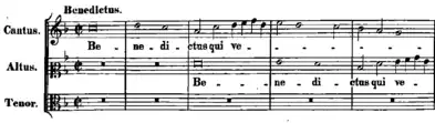 The Benedictus is written for three voices, the soprano (cantus), the alto (altus), and the tenor. The opening motif is only three bars long before a variation on the melody is sung. Variations on this main melody are repeated throughout the piece.