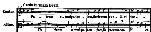 The Credo features balanced alternations between duet, trio, and full four-voiced textures, with a striking chordal homophony at the heart on the text "et incarnatus est." Once again a bass sequence marks the end. The opening motif is sung as a duet between alto and soprano voices before the tenor and alto sing a variation of the original motif.