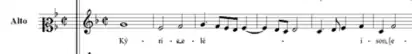 The Kyrie begins with a sevenfold opening imitation, contrasts a new melody for the Christe section, and then closes with a motif similar to the first; the bass voice caps the movement with an extended, downward melodic sequence. The opening motif starts in the alto and is gradually repeated throughout by the other voices.
