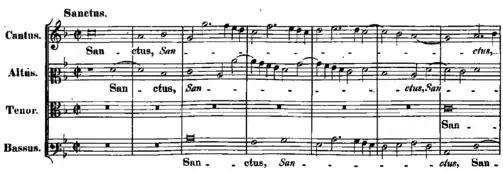 In the Sanctus Palestrina quotes the same chant melody (from the Gregorian Mass XV) as in the Missa Papae Marcelli; the movement's opening also resembles the melismatic Sanctus of that mass. A comparison of the two melodies is shown at right.