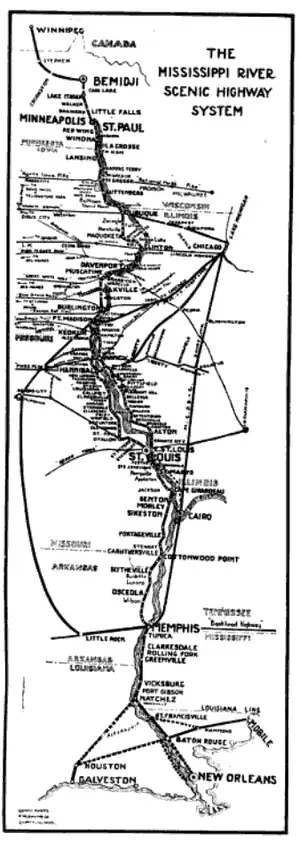 The Mississippi River Scenic Highway was part of a series of auto trails in the United States to promote travel along the Mississippi River. The organization was headquartered in St. Louis, though each state or division had their own organization,[2] which worked with local cities and towns along the route.[3] The highway has been largely replaced with Great River Road by the 1970s.[4]