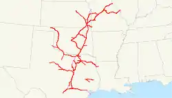 ![]() Katy system as of 1918; many of the outlying lines left the system in the 1923 reorganization | |