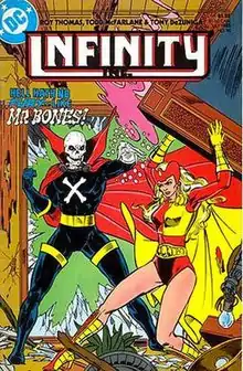 Mister Bones (Robert Todd) is a character in the DC Comics Universe, created by Roy Thomas, Dann Thomas, and Todd McFarlane, in Infinity, Inc. #16 (July 1985).[1] A former low-level supervillain and member of Helix, he reformed and joined the Infinity Inc. team, then later the Department of Extranormal Operations (a government agency which regulates superhero activity) as a bureaucrat, eventually rising to the rank of Regional Director for the Eastern Seaboard. Thus, he now wears a suit and tie instead of a costume, and is also known as Director Bones.[2] A chain-smoker, he had a habit of speaking in rhyme in early appearances, but he no longer does so.