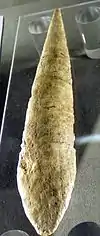 The bone points at Mladeč have been found at other Central European sites in an Aurignacian context.[11][12] None of the bone points from Mladeč have a split base, and in fact have a massive base.[11] These artefacts are referred to as Mladeč-type bone points or bone projectiles.[11][13] When found at other sites with split base bone points occurring in a separate layer, the layer with Mladeč-type bone points is always found above the layer with split base bone points.[11] The Mladeč-type bone points appear in an Aurignacian context after 40,000 BP.[14]