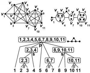 The final tree has one-element sets of vertices of as its leaves, due to the base case. A set of vertices of is a module if and only if it is a node of the tree or a union of children of a series or parallel node. This implicitly gives all modular partitions of . It is in this sense that the modular decomposition tree "subsumes" all other ways of recursively decomposing into quotients.