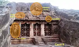 The front is flanked by two dvarapalas (damaged). They are in tribhanga-pose, both equipped with Shaiva motifs. Between them are two pillars, square at their ends and octagonal between. Three gavaskas decorate the top of the facade. The nasika kudus, vyalamukhas and sakti-dvaja artwork can readily traced. The entablatures here include playful elephants, lions, bulls and mythical fused animals. Inside the damaged stambha torana, at the top of the rock face is a Tandava Shiva (dancing Shiva). It is damaged, but three items can be identified – the damaru, the parasu and the trisula. A notable aspect of this dancing Shiva and Naga (snake) is that it reflects the Odisha-tradition; it was likely carved by a shilpin from Odisha. This iconic style of Nataraja becomes a standard relief on the sukanasi or the ceiling in the Eastern Chalukyan temples of later times.[8]