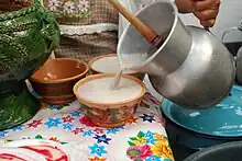 Despite the introduction of wheat and rice to Mexico, maize is the most commonly consumed grain in almost all areas of the country and serves as the main ingredient in many local recipes (e.g. maize tortillas, atole, pozole, menudo, tamal). While also eaten fresh, most maize is dried, nixtamalized and ground into a dough called masa.[11][12] This dough is used both fresh and fermented to make a wide variety of dishes from drinks (atole, pozole, etc.) to tamales, sopes, and much more. However, the most common way to eat maize in Mexico is in the form of a tortilla, which accompanies almost every dish. Tortillas are made of maize in most of the country, but other regional versions exist, such as wheat in the north or plantain, yuca and wild greens in Oaxaca.[4][11]