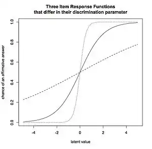 The Double Monotonicity model adds a fourth assumption, namely non-intersecting Item response functions, resulting in items that remain invariant rank-ordering.[11] There has been some confusion in Mokken scaling between the concepts of Double Monotonicity model and invariant item ordering.[12] The latter implies that all respondents to a series of questions all respond to them in the same order across the whole range of the latent trait. For dichotomously scored items, the Double Monotonicity model can mean invariant item ordering; however, for polytomously scored items this does not necessarily hold.[13] For invariant item ordering to hold not only should the item response functions not intersect, also, the item step response function between one level and the next within each item must not intersect.[14]