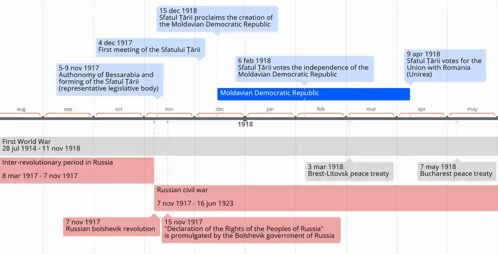 The brief history of the 1917-1918 Moldavian Democratic Republic can be divided into three periods: the period of autonomy within Russia, the period of independence, and the period of federation with Romania. On 2/15 December, Moldavia proclaimed itself a constituent republic of the Russian Federative Democratic Republic. On 1/14 January 1918, the Front Section of the Rumcherod Bolsheviks entered Chișinău, the capital of the nascent republic. After the nationalist faction of the Sfatul Țării requested military assistance from Romania, the Romanian Army crossed the republic's border on 10/23 January, taking the capital within days. With the Romanian Army in full control, on 24 January/6 February, the Moldavian Democratic Republic proclaimed its independence. On 27 March/9 April, Moldavia entered a conditioned union (essentially a federation) with the Kingdom of Romania, retaining its provincial autonomy as well as its legislative body (the Sfatul Țării). On 27 November/10 December, after the end of World War I, a secret meeting of Sfatul Țării members renounced all conditions and proclaimed the unconditional union of Bessarabia with Romania, effectively amounting to an annexation by the latter.[2] This was its last act, as it was subsequently dissolved and prominent unionists were invited to Bucharest.[3] During its 1-year existence, the Moldavian Democratic Republic had three Prime Ministers: Pantelimon Erhan, Daniel Ciugureanu and Petru Cazacu.