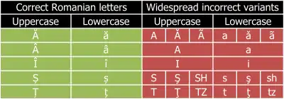 The Romanian alphabet is a variant of the Latin alphabet used for writing the Romanian language. It is a modification of the classical Latin alphabet and consists of 31 letters,[1][2] five of which (Ă, Â, Î, Ș, and Ț) have been modified from their Latin originals for the phonetic requirements of the language:
