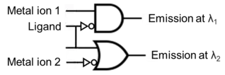 The INHIBIT logic gate incorporates a Tb3+ ion in a chelate complex. This two-input logic gate is the first of its kind and displays non-commutative behavior with chemical inputs and a phosphorescence output. Whenever dioxygen (input “1”) is present, the system is quenched and no phosphorescence is observed (output “0”). The second input, H+, must also be present for an output “1” to be observed. This is understood from a two-input INHIBIT truth table as included in Table 2.[13]