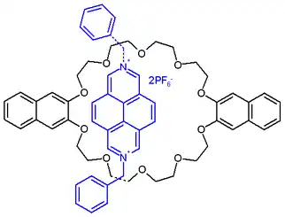 In another XOR logic gate system, the chemistry is based on the pseudorotaxane depicted in Figure 11. In organic solution the electron-deficient diazapyrenium salt (rod) and the electron-rich 2,3-dioxynaphthalene units of the crown ether (ring) self-assemble by formation of a charge transfer complex. An added tertiary amine like tributylamine forms a 1:2 adduct with the diazapyrene and the complex gets dethreaded. This process is accompanied by an increase in emission intensity at 343 nm resulting from freed crown ether. Added trifluoromethanesulfonic acid reacts with the amine and the process is reverted. Excess acid locks the crown ether by protonation and again the complex is de-threaded.[17]