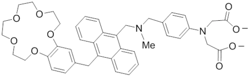 In a modification of system B, not two, but three chemical inputs are simultaneously processed in an AND logic gate. An enhanced fluorescence signal is observed only in the presence of excess protons, zinc and sodium ions through interactions with their respective amine, phenyldiaminocarboxylate, and crown ether receptors. The processing mode operates similarly as discussed above – fluorescence is observed due to the prevention of competing photoinduced electron transfer reactions from the receptors to the excited anthracene fluorophore. The absence of one, two, or all three ion inputs results in a low fluorescence output. Each receptor is selective for its specific ion as an increase in the concentration of the other ions does not yield a high fluorescence. The specific concentration threshold of each input must be reached to achieve a fluorescent output in accordance with combinatorial AND logic.[18]