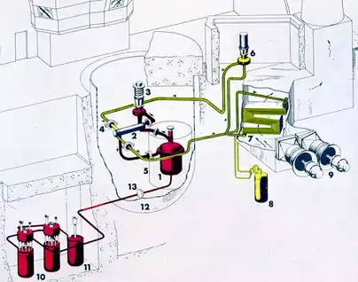 - ↑ MSRE Legend: 1) Reactor vessel; 2) Heat exchanger; 3) Molten salt fuel pump; 4) Freeze flange; 5) Thermal shield; 6) Coolant salt pump; 7) Radiator; 8) Coolant salt drain tank; 9) Fans; 10) Fuel salt drain tanks; 11) Flush tank; 12) Vessel; 13) Fuel salt freeze valve. —ORNL-LR-DWG 63-1209R