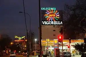 View of the Monarch sign at night, from Rancagua Street. At the distance can see the Valdivieso advertising sign.