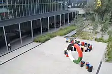 The project plan had to take into consideration the placement of the original building. It is positioned between different buildings and faculties, surrounded by garden areas. Taking this into consideration, an approach that emphasised flow and connectivity was taken, described as a ‘cultural exchange’ or a continuum from internal to external.[15] Set between two buildings on Dandenong Road is the art installation Silverscreen by Callum Morton which serves as ceremonial entry into the MUMA precinct.[16]
