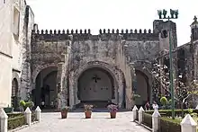 The Augustinian monastery of San Juan Bautista in Yecapixtla was planned by Jorge de Ávila and Jeronimo de San Esteban, based on the plans for the Metropolitan Cathedral in Mexico City.[14] There is an atrium wall with 365 triangular sculptures which are similar to those in teocallis as well as merlons.[12] The atrium area conserves its corner chapels and its center stone cross. The façade of the church is considered to be one of the purest examples of Renaissance architecture in New Spain,[6] but it does features a Gothic style rose window.[14] The cloister is large and well-lit,[11] but it has only one floor in the back; normally cloisters have two floors all the way around. The front of the cloister does have two floors.[6] In the portal for pilgrims, there is an image of the Virgin Mary surrounded by cherubs. This image has a blue background, a color rarely used in the decoration of churches and monasteries of this time. The vault on the lower floor of the cloister is at least 10 meters high off the floor and has remnants of mural painting such as Stations of the Cross and some of the daily life of Augustinian friars.[4] It contains a fountain from the 17th century.[14]