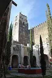 The monastery of Santiago Apostol in Ocuituco dates from 1534 and is the first Augustinian monastery on the American mainland, with Fray Juan de Zumárraga celebrating its first mass in 1534.[4][11] It served as not only an evangelization center, but also a training center for monks.[14] The monastery has a vault in the lower floor of the cloister which used browns, whites and greens in its figures. The chapel for pilgrims is closed, unlike the other monasteries, but the rest of the complex is open to visitors.[4] There have been some modifications to the buildings since they were built, but one well-preserved element is its 16th-century stone fountain, the oldest of all the monasteries of the World Heritage Site.[6][14] This fountain is a replica of one found in the Alhambra in Córdoba. It features six sandstone lions facing the center, which were sculpted by indigenous craftsmen.[11] Located on the outside of the cloister, there is another fountain that used to be known as the Fountain of the Mermaids (Fuente de las Sirenas), but it has badly deteriorated. Both provided the community with water which flowed to them from Popocatepetl.[14]