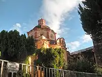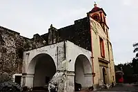 The monastery of San Juan Bautista in Tetela del Volcán was built by the Dominicans in the first half of the 16th century and was even visited by Hernán Cortés.[11] It is at a high altitude near the volcano surrounded by pine forest in a relatively cold climate.[6][14] The exterior has arcades that surround the complex but are partially hidden by trees.[14] The upper parts of the walls around the complex are covered in paint; the lower floor of the cloister has figures depicted in the arches and walls. Many are of Augustinian monks. In the vaults over the walkways, there are numerous cherubs which are defeating evil spirits and some are even fighting with each other.[4] One unique architectural element is the Moorish-style wood-beam roofing in the sacristy.[6] There is a crafts market held here each Wednesday.[14] The atrium have a series of frescos of very high quality, painted by a local indigenous artist in the 16th century.[15] They were restored in 2008.[16]
