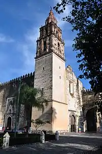 The monastery of La Asunción in Cuernavaca is better known as the city's Cathedral. It was founded by the Franciscans, and originally permitted only indigenous nobles to enter its grounds along with the Spanish. It was the fifth construction in New Spain ordered and supervised by Toribio de Benavente Motolinia. The only one of the fourteen monasteries that were originally inscribed to have suffered significant changes over its history, the cathedral has been modified several times.[14] Because of the importance of the city and the church's role as an ecclesiastical seat, the church and grounds were modified. The large open chapel was reconditioned as a portal and the atrium chapels were enlarged into churches of significant size.[6] The last round of major renovations and changes, which included the restoration of its murals by specialists and the addition of modern elements, especially in the main altar area, occurred in the late 1970s and early 1980s.[14] The cloister retains a number of frescos, some of which depict New Spain missionaries in the Philippines and Japan.[6] The open chapel is frequently used for weddings.[14]