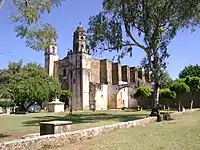 The monastery of Santo Domingo de guzmán in Hueyapán has the highest altitude of the monasteries in the state of Morelos, with its climate cold compared to most of the rest of the state.[6] It is one of the monasteries closest to the volcano. It was founded by the Dominicans, but its cloister was built of adobe and wood with a tile roof instead of stone. It disintegrated relatively quickly due to the elements and was abandoned.[4] It remains mostly closed to this day. Only the atrium area is open to visitors and this closes by 1pm each day.[4][11] The austere façade of the main church survives and it has a notable Barorque niche.[6][11] It is also possible to see a number of its remaining murals.[14]
