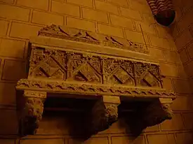 The bell tower's facade features 17th-century blue and white carvings, and includes the founder's date and name in Valencian. The cloister is arranged in four galleries on two floors encircling a garden. The lower cloister includes arches and vaults in two-coloured Mudéjar style reminiscent of the Córdoba mosque. The sala capitular houses the remains of Prince John and Princess Blanche of Aragon, children of the mediaeval Duke Alfonso the Old.