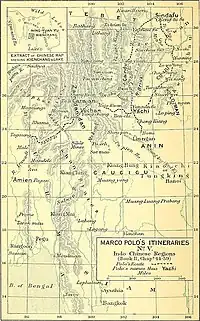 - ↑ Marco Polo's "account is in almost perfect agreement with what we know from Chinese sources on the production or imports, forms, values and exchange rates, weights, denominations as well as use of these currencies in public and private domains. These findings support the argument of Haw[62] and others that Marco Polo's account of the itinerary from Cambaluc to Yunnan, Myanmar and Annam [Đại Việt or Caugigu] is so good (and so much better than has ever previously been appreciated) that he almost certainly undertook it himself."[63][lower-alpha 3]