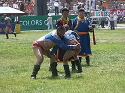 Mongolian wrestling, known as Bökh (Mongolian script: ᠪᠥᠬᠡ; Mongolian Cyrillic: Бөх or Үндэсний бөх), is the folk wrestling style of Mongols in Mongolia, Inner Mongolia and other regions where touching the ground with anything other than a foot loses the match.[1] Bökh means "firmness, reliability, vitality, wrestler", from Mongolic root *bekü "firm, hard, solid; fighter, strong man"[2] possibly from Turkic *böke "warrior" < "big snake".[3] Wrestling is the most important of the Mongolian culture's historic "Three Manly Skills", that also include horsemanship and archery. Genghis Khan considered wrestling to be an important way to keep his army in good physical shape and combat ready. The court of the Qing dynasty (1646–1911) held regular wrestling events, mainly between ethnic Manchu and Mongol wrestlers. There are several different versions, Mongolian, Buryatian (in the Buryatia of Russia), Oirat and Inner Mongolian.