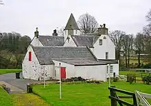 Monkredding's modern form surrounds three sides of a square, open to the north. The west wing and stair-tower are ancient.[8] The west wing bears a date stone '1602 or 1605' in the north gable, whilst the remainder was added in 1638,[9] this date being inscribed on a dormer pediment in the west wall; the lower floor is vaulted. Whitewashed roughcast harling covers the masonry; the roof has been lowered; the circular stair-tower has been significantly raised in height. No dormers are now present and the crow-steps have been removed.[8] The 17th-century building was enlarged and re-orientated in the early 19th century when the principal facade and central entrance were extended south.[10] Monkredding House is B Listed.[11]