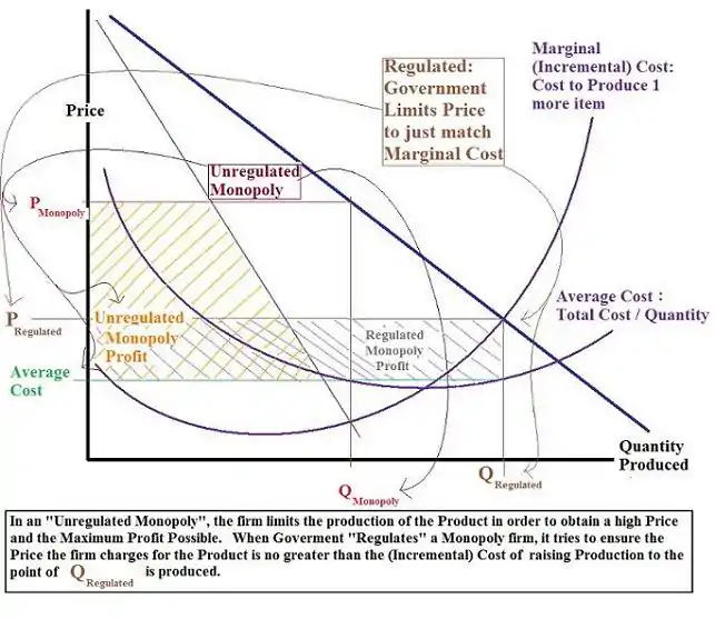 If a government feels it is impractical to have a competitive market, it sometimes tries to regulate the monopoly by controlling the price the monopoly charges for its product.[4][2] The old AT&T monopoly, which existed before the courts ordered its breakup and tried to force competition in the market, had to get government approval to raise its prices.[2] The government examined the monopoly's costs and determined if the monopoly should be allowed to raise its price; if the government felt that the cost did not justify a higher price, it rejected the monopoly's application. Although a regulated monopoly will not have a monopoly profit that is high as it would be in an unregulated situation, it still can have an economic profit that is still above what a competitive firm has in a truly competitive market.[2]