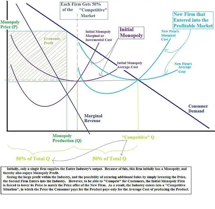 Introducing new competition in what was previously a monopoly removes monopoly profit. Only two firms are shown here to make illustration of the additional competition easier. In normal circumstances, it takes more than two firms to form a competitive situation, and having only two firms forms a duopoly.