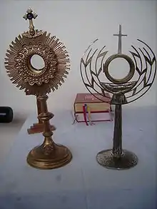 A monstrance, also known as an ostensorium (or an ostensory),[1] is a vessel used in Roman Catholic, Old Catholic, High Church Lutheran and Anglican churches for the display on an altar of some object of piety, such as the consecrated Eucharistic host during Eucharistic adoration or Benediction of the Blessed Sacrament. It is also used as a reliquary for the public display of relics of some saints.[2] The word monstrance comes from the Latin word monstrare,[3] while the word ostensorium came from the Latin word ostendere. Both terms, meaning "to show", are used for vessels intended for the exposition of the Blessed Sacrament, but ostensorium has only this meaning.[2]