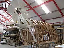A Dutch organisation, "Christians for Israel" (Dutch: Stichting Christenen voor Israël) promoted the scheme. A model of Stelling Minnis windmill, built by Tom Holman, was taken to the Netherlands to raise funds for the restoration. None of the original machinery survives.[10] Millwright Willem Dijkstra rebuilt the floors, sails, cap and machinery in his workshop in Sloten in cooperation with Dutch construction company Lont and British millwright Vincent Pargeter. The windshaft was cast and machined at Sanders IJzergieterij en Machinefabriek B.V. (Sanders’ foundry and machines factory) in Goor.[11] The parts were then shipped to Israel and reassembled on site.[12] Dijkstra, his family and employee temporarily moved to Israel to help with the restoration.[11] The cap and sails were lifted into place on July 25, 2012,[13][14] and the mill was turning for the first time again on August 6.[15][16] The first bag of flour was ground in May 2013.[7]