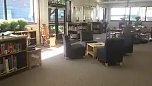The Montpelier High School library media program is constantly evolving to best meet the needs of students, staff and community members. The fiction collection is continuously expanded and updated with newly-published and classic books in various formats. The non-fiction and reference collection is kept current with online database subscriptions. The library website allows access to these databases, online newspapers, the library catalog, research support, tech and social media tips as well as reading suggestions. These services are available 24/7 from any device with internet access or in the library during school hours. Multimedia equipment (video and audio recorders, tripods, laptops and other devices) are also available for school related projects. The space is open, light filled, flexible and accessible and hosts a wide range of academic, social and civic activities throughout the year.[9]