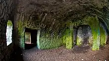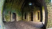 There was a prehistoric burial site at the summit of Montpelier Hill and stones from it were used in the construction of the lodge.[11] A nearby standing stone was also used for the lintel over the fireplace.[19] Shortly after its completion, a great storm blew the original slate roof off. Local superstition held that this was the work of the Devil, an act of revenge for disturbing the ancient cairn.[20] Conolly had the roof replaced with an arched stone roof constructed in a similar fashion to that of a bridge.[16] This roof has remained intact to the present day, even though the building has been abandoned for over two centuries and despite the roof being set alight with tar barrels during the visit of Queen Victoria to Ireland in 1849.[20][21] There is little evidence that the lodge was put to much use. Conolly himself died in 1729.