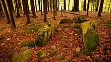 In 1978, the archaeologist and historian Patrick Healy discovered the remains of a prehistoric wedge tomb in the woods.[45] All that survives is the skeletal outline of the main chamber and the outer double walls.[76] Most of the stones were removed to build the low stone wall that runs across the front of the tomb.[77]